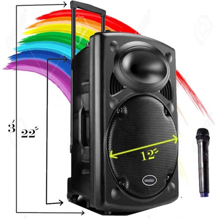 Dual microphone input, 12" loudspeaker, 3" x 1 horn, 22-inch box height, Bluetooth compatible, FM radio, dual power source remote control, black color, 340 x 260 x 500 mm dimension, an eco system, 4.6 Kg net weight.