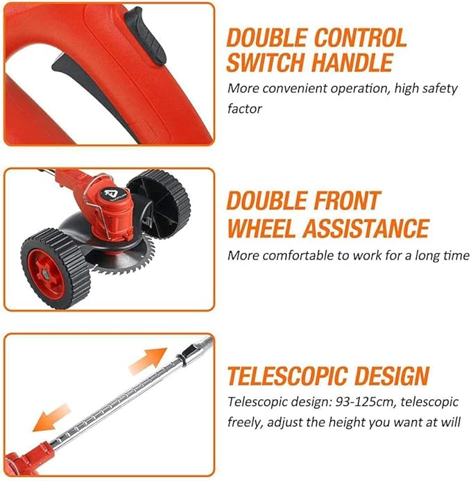 - Adjustable Height & Rotating Head: The weed wacker has a one-key adjustable telescopic pole can adjust the length. Provide the required length for all heights people without bending over. Work in a comfortable position. The mower head angle is adjustable from 0-90°, allowing you to easily care for every corner.